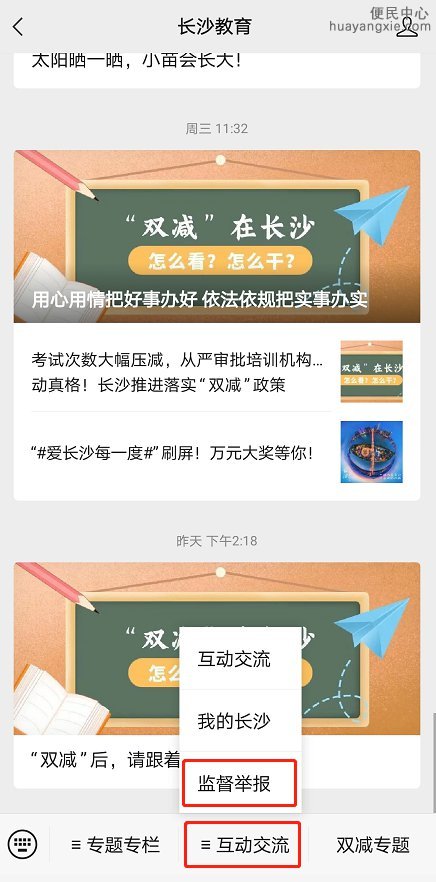 3.“长沙教育”微信公众号进入举报平台入口:进入“长沙教育”微信公众号,点击下方“互动交流”菜单栏,点击“监督举报”,进入平台。