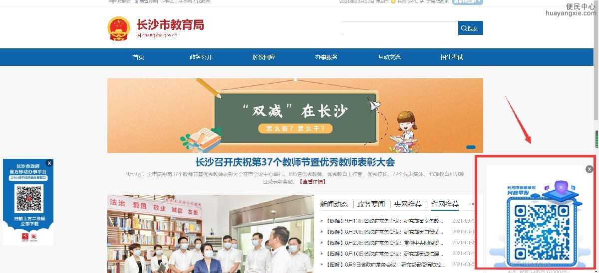 2.长沙市教育局官网进入举报平台入口:进入“长沙市教育局”官网,扫描浮窗二维码,进入平台。