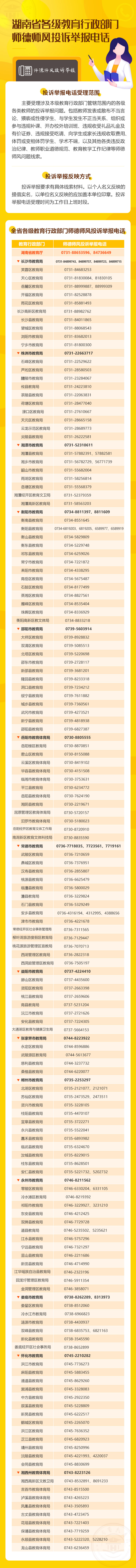湖南全省各级教育行政部门师德师风投诉举报电话 作者:小便 • 更新时间:11天前 •阅读 全省各级教育行政部门师德师风投诉举报电话 律法普法-吕娟律师 https://www.huayangxie.com/jiaoyuju/2378.html