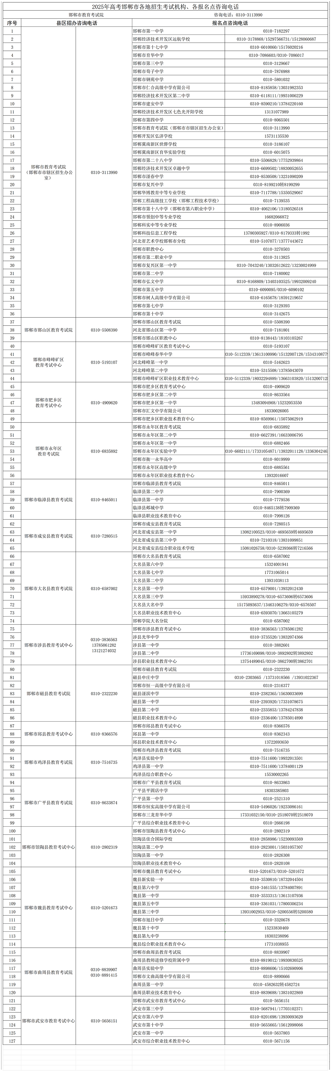 2025年高考邯郸市各地招生考试机构、各报名点咨询电话 作者:小便 • 更新时间:4天前 •阅读 2025年高考邯郸市各地招生考试机构、各报名点咨询电话 律法普法-吕娟律师 https://www.huayangxie.com/jiaoyuju/2953.html